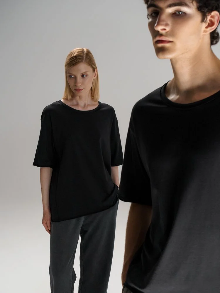 Футболка унисекс свободной посадки Vozduh создана для тех, кто следит за трендами и ценит комфорт. Необработанные края рукавов и низа изделия добавляют ему оригинальности и легкой небрежности, а боковые вставки создают притягательный летящий силуэт.