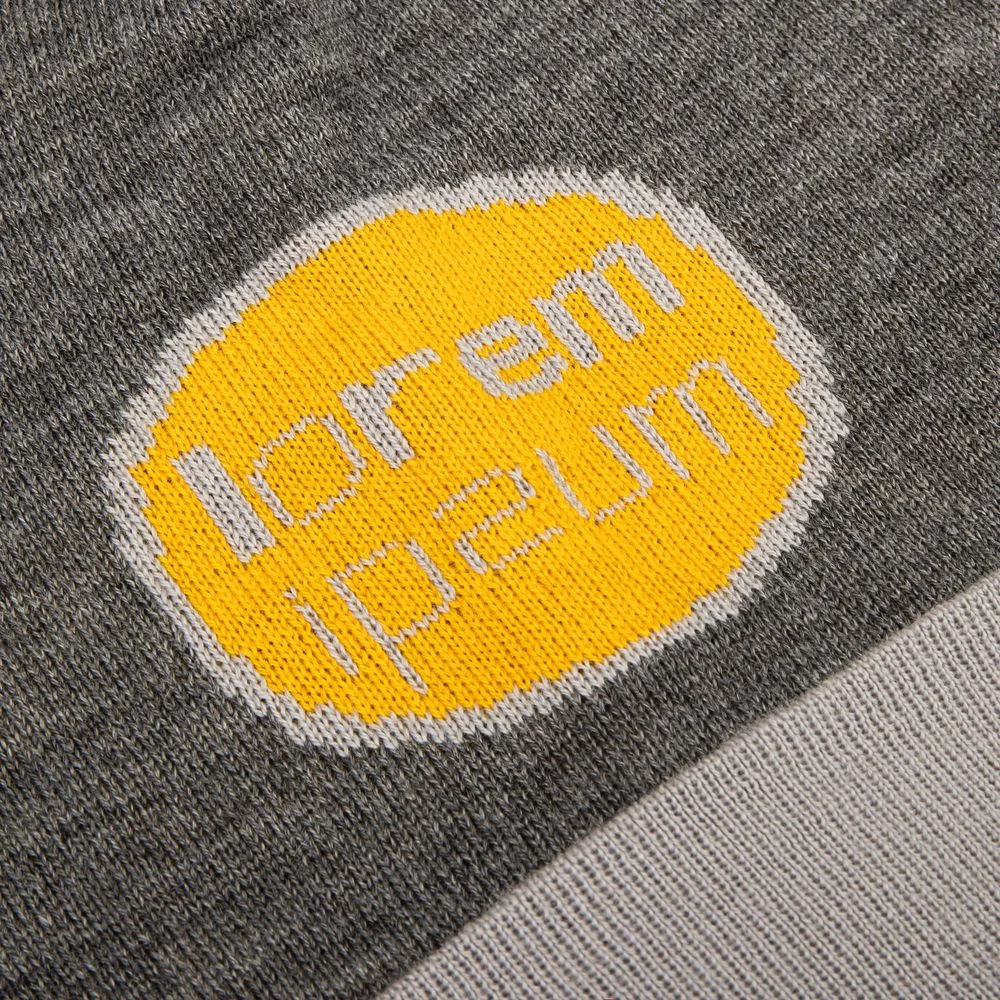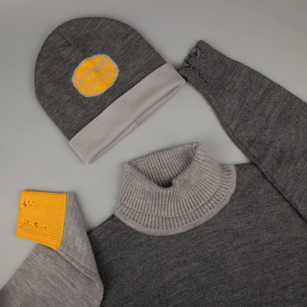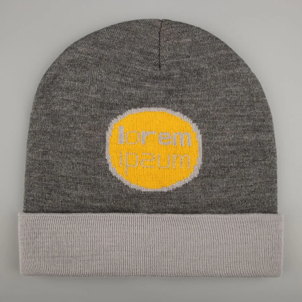 Шапка с вывязанным логотипом и индивидуальным рисунком в фирменной цветовой гамме.