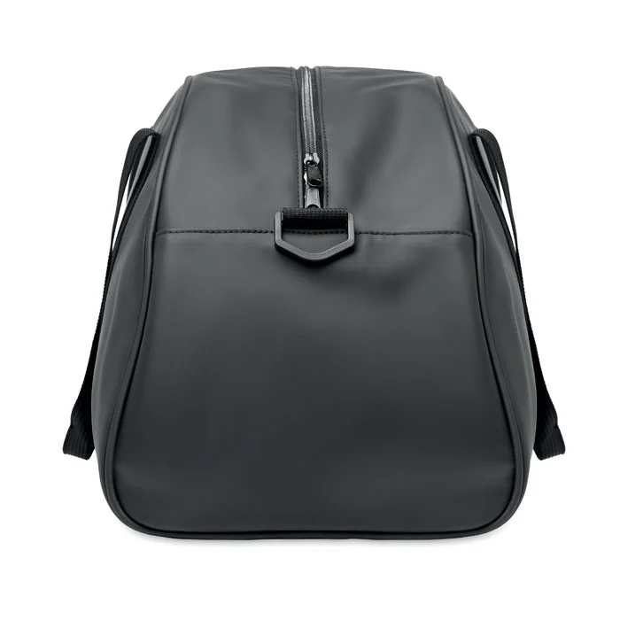 Duffle bag in soft PU with bottom foam reinforcement. One main compartment, zippered front pocket and zippered inner pocket. 210D RPET polyester lining. 2 handles and one adjustable and detachable shoulder strap